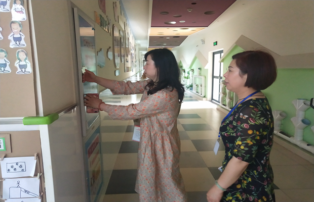 徐园长在罗幼谢菊仙园长,荆海芬副园长的带领下,查看了校园环境和区域环境,对现有材料和环境提出了自己的想法与建议;观摩了幼儿在课堂中的分享交流,对教师提出了更高的要求;重点查看了食堂库房、卫生及消防设施设备的使用等情况,强调了幼儿园安全的重要性。