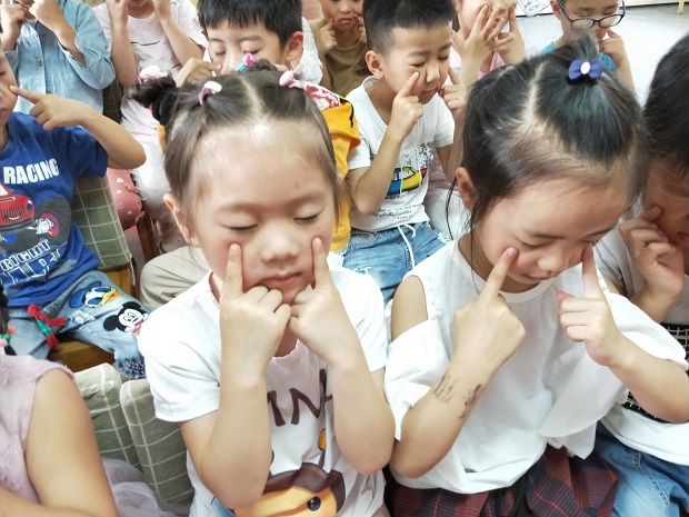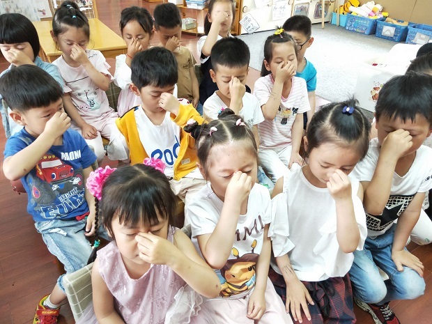 最后老师还和孩子们一起学做眼保健操,孩子们在说说、做做过程中进一步提高幼儿的眼保意识。