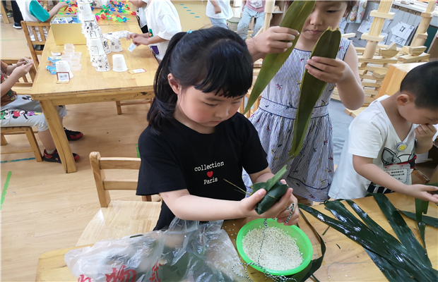在爸爸妈妈的指导下,孩子们第一次尝试了包粽子。他们还品尝了自己动手做的粽子和爸爸妈妈带来的咸鸭蛋,味道真不错!