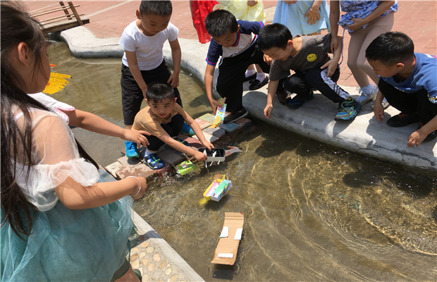 当然端午节也少不了赛龙舟的活动。大班的孩子们利用材料制作了一艘艘逼真的龙舟,来到水池区放入水中,颇有赛龙舟的架势呢!