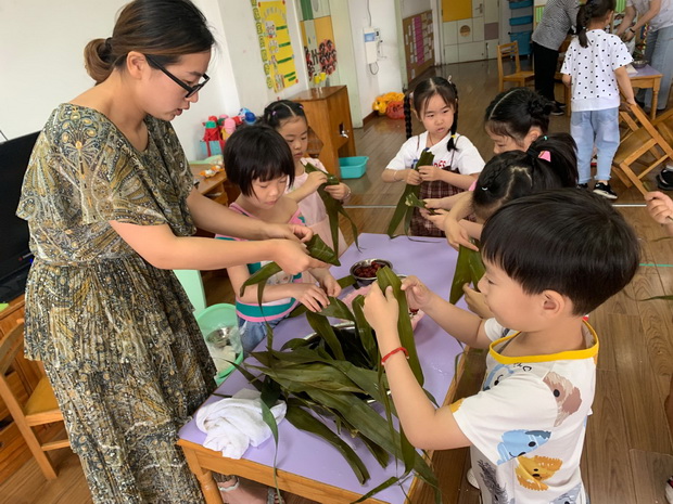 为了让孩子们切实感受端午节的传统习俗——包粽子、吃粽子,孩子们带来了各种食材,老师为孩子们展示起了包粽子技巧,并手把手指导孩子们亲自体验。在大手小手的合力下,一个个饱含爱心的粽子最终被孩子们自豪地捧在手心,动人的小脸上也溢满着喜悦……。