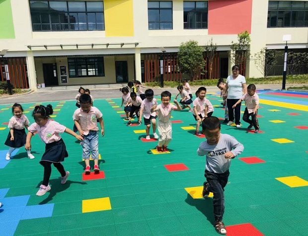 在欢声笑语中,他们又来到了户外场地。还在新场地上,蹦蹦跳跳地玩了起来。有的孩子说:“这里的操场真漂亮,像彩虹一样!。”有的孩子说:“我们可以在这里玩很多好玩的游戏!”还有的孩子说:“要是有一个大滑滑梯就好了!”…… 孩子们纷纷表达着对新幼儿园的无限畅想。