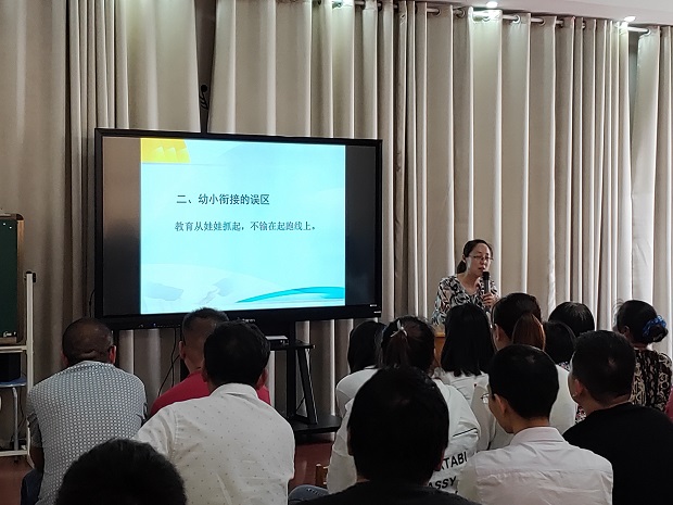 讲座中何校长通过图文结合、讲案例的形式分别从幼儿园和小学的不同;幼小衔接的误区以及做好哪些方面的衔接这三方面进行介绍。讲座中强调了要从生活提前接轨、提升期待值、习惯的培养三方面来做好幼小衔接工作,尤其强调自理能力、专注力、阅读兴趣的重要性。要求我们的家长在入小学前充分利用好暑假这个假期科学、正确地对孩子们进行引导、教育不管是种花还是种树都要在根上下功夫,她说:“智力就是阅读能力,做好起步阶段工作将赢得学习先机。”
