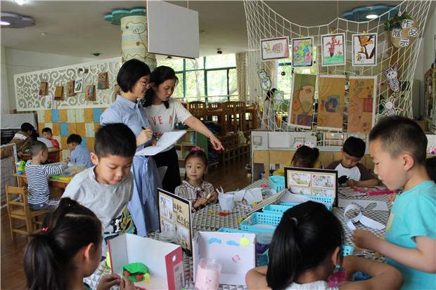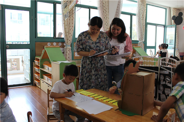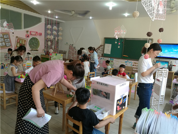 在戏剧主题活动开展两周后,老师们进行了第一次进班观摩区域游戏现场的活动。每个班围绕本班的戏剧主题活动创设了美工区、表演区、阅读区、建构区、益智区、科探区等区域游戏,如大二班的戏剧主题是《遇见你真好》,结合戏剧中的主要角色霸王龙和小棘龙,游戏材料和情境大都与恐龙有关,如益智区的恐龙拼图、恐龙棋;科探区的恐龙考古;美工区的恐龙粘土、制作恐龙……