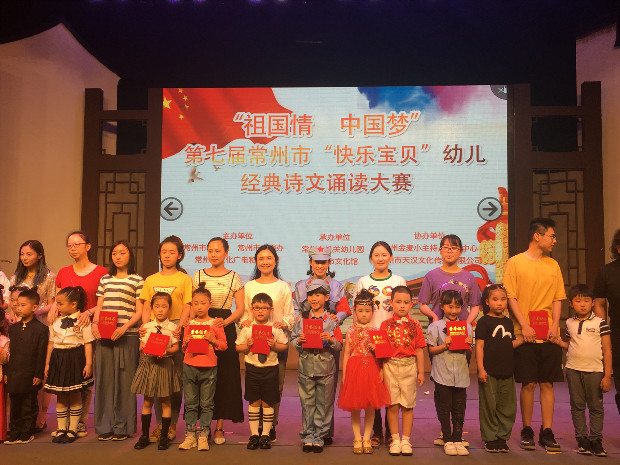 为庆祝中华人民共和国成立七十周年,激发孩子的爱国热情,传承和弘扬中国优秀传统文化,打造“书香常州·幸福阅读”品牌,让孩子在诵读的海洋里邀游并得到智慧启迪,不断提升常州少年儿童的文化自信。常州市文明办、常州市教育局、常州市文化广电和旅游局于2019年6月18日联合举办了以“祖国情·中国梦”为主题的第七届常州市“快乐宝贝”幼儿经典诗文诵读大赛。由高强和黄静潇两位老师带领的百丈中心幼儿园参赛团队以9.45分的全场最高分取得了大班组一等奖中的第一名。