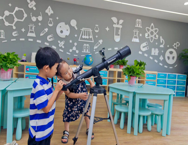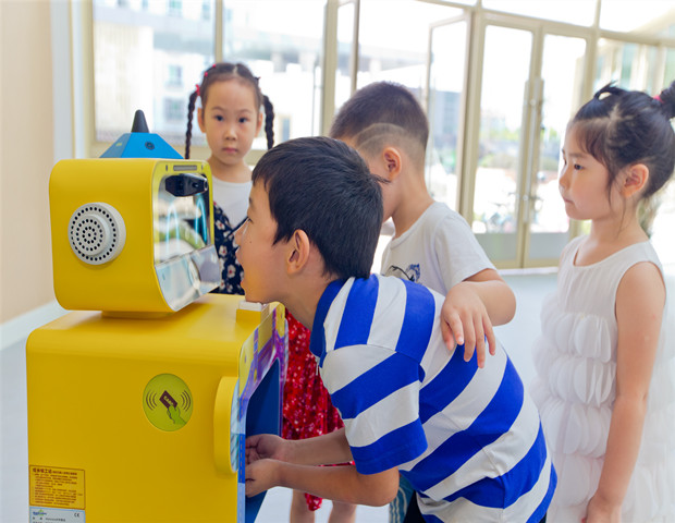 盘龙新园区地处特色小镇发展板块,多处渗透智能传感元素。这里有智能晨检机器人与幼儿进行语音互动、体温测量,趣味晨检在缓解入园高峰时段晨检压力的同时,还能获取数据追踪呵护幼儿健康,科学有童趣;这里有“互动地带”游戏区的模拟球场和街区体验,让孩子在室内就能拥有室外足球的畅快愉悦,交通安全的模拟体验,游戏蕴教育;这里有科学发现室的星系体验和自主创意,幼儿可为飞船涂上颜色,翱翔太空,与行星对话,神奇有魔力……