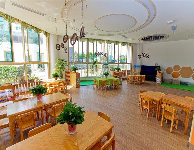 盘龙新园区主体建筑借鉴蜂巢设计概念,主建筑外形及班级、专用室均为六边形蜂巢,将可使用的空间最大化、光照率最大化,内部和外部空间更有活力和凝聚感。文化设计崇尚自然格致的森系格调,室内外整体色调以原木色和白色为主,简洁大方、清新雅致,体现学校崇尚自然、生命、尊重、和谐的文化理念。