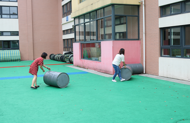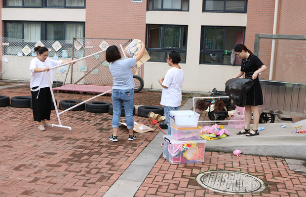 会议结束后,所有教职工带着任务回到自己所在区域,开始了户外整理创设工作:材料的整理、清洗、摆放、收纳、学习故事、标记的创设……同时还与同区域成员做好分工站位的交流工作,对每一个材料和设备设施做细致检查。