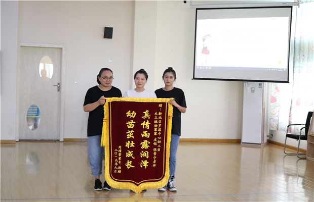 主题活动中,周瑾萱家长送来了绣着“真情雨露润泽,幼苗茁壮成长”字样的锦旗和感谢信。由谢菊仙园长转送到大3班徐黎黎、庄铭、张常宁老师手中,表达了家长对老师们辛勤付出和无私关爱的感激之情。收到锦旗后,谢菊仙园长表示:教师工作得到了家长的认可,这是对幼教工作最大的肯定。