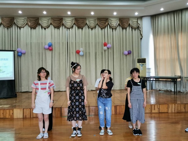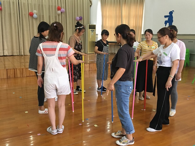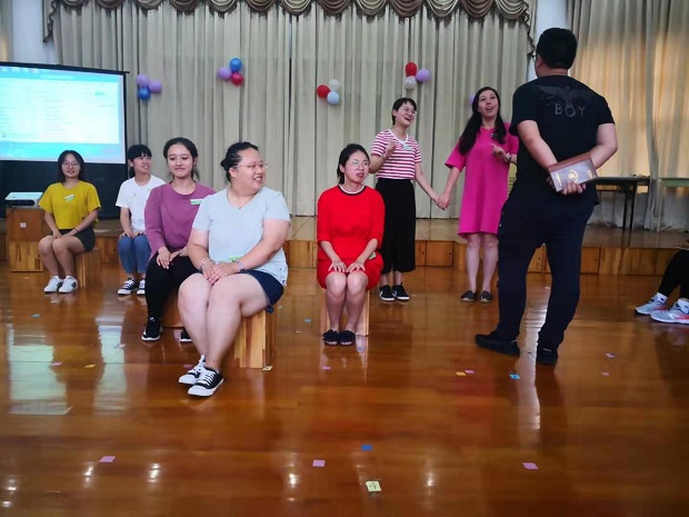 活动的第一环节是“节日微语”,每位老师都在舒缓的音乐声中写下了对同伴的真诚祝福,一张张爱心贴充满了暖暖的情谊。紧接着,殷园长为全体教师送上了节日的祝福。接下来,三个年级组的教师们分别献艺为节日添彩:大班组的原创方言三句半《夸夸老师》,把每位教职工夸了一遍,风趣又暖心;中班组的歌表演《老师,老师》动感十足,嗨翻全场;小班组的诗朗诵《青春、师爱、畅想》,道出了每位教师的心声。在团建游戏“不倒森林”中,同伴们相互信任,默契配合,展现了团队的凝聚力。活动的最后一环节是获得区德育先进者的优秀教师发言,王老师结合从教经历进行了“不忘初心,奋力前行”的主题发言。
