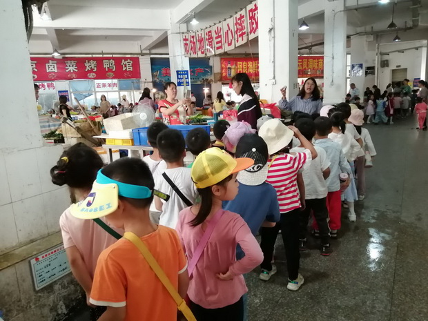 然后我们又带领小朋友们参观了新民菜场。看,孩子们都争先恐后的告诉老师自己认识的蔬菜,认真、可爱的模样也深深受到菜市场伯伯、婶婶们的喜爱,大家纷纷当起了孩子们的老师,热情地举起蔬菜类、肉类给孩子们观察并讲解。