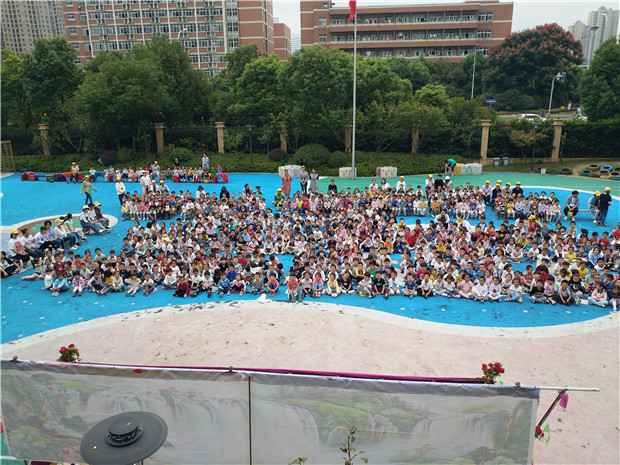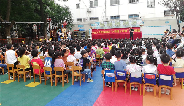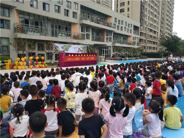 2019年9月26日上午上海小主人木偶剧团“小剧情、大故事”走进校园,河海幼儿园全体师生相聚在操场一起观摩。