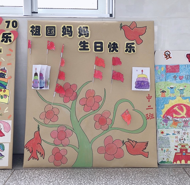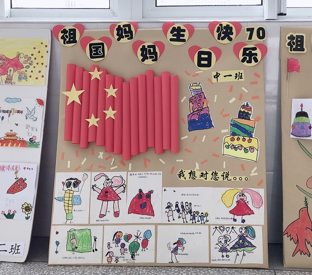 大班的孩子用讲故事、唱歌祝祖国妈妈生日快乐。同时孩子们和家长一起画祖国妈妈的大好河山。老师们布置展板,为祖国妈妈的生日献上一份祝福。