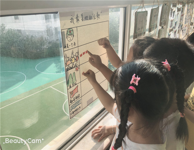 好的幼儿园课程应该是综合的、统整的,要裹挟儿童共同亲历,在亲历中应和其成长节拍。接到“红歌合唱”比赛消息,大班孩子们利用谈话、游戏时间一起认真谋划起来。扩大班级音乐区的空间、添置移动音箱、招募合唱团成员等,音乐区每一天都很热闹。分享交流中,孩子们也发现了很多问题:歌词记不住怎么办?大家唱不整齐怎么办?一直站着唱,观众不要听怎么办?……讨论中大家达成了共识,制作歌谱、选小小指挥员、增加道具等应对策略也生成了。在整个活动推进中,我们深信,孩子的内心有一股热浪在涌动,那就是一个大写的“爱”字,对游戏的喜爱,对活动的深爱,对祖国的热爱!