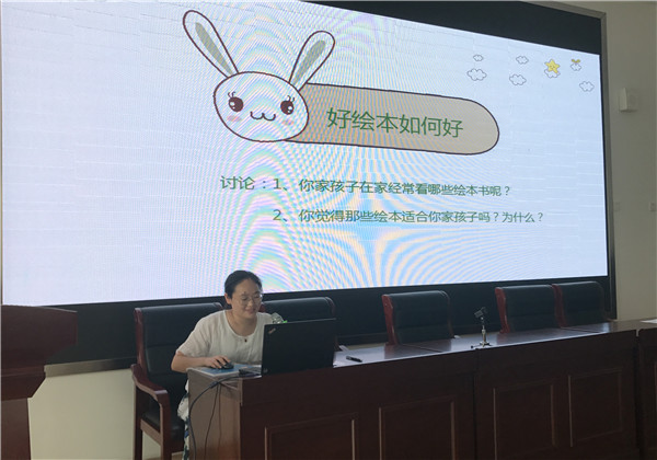 活动中,朱丽老师首先向爸爸妈妈们介绍了怎样的绘本是好绘本,以具体的绘本案例总结出好绘本是能给孩子提供一个“体会的过程”,让孩子学会打开情感的出口和入口。这样的绘本是结合了故事内容的,通过角色的造型、故事内容的设计、配角的引导,以及伏笔、背景、气氛、意义等关键点元素的,让读者读完之后能够完整地诠释故事内容。同时,朱老师详细地给家长们介绍了如何给孩子挑选绘本,第一,绘本中语言通俗易懂。第二,图画会传达信息。第三,意境要贴近孩子的世界。第四,获国际大奖的绘本。最后,朱老师还向大家推荐的一些适合不同年龄段幼儿阅读的绘本。如小班的《你好》、《小蓝和小黄》等;中班的《我不是胆小鬼》、《小黑鱼》等;大班的《花婆婆》、《100万只猫》等。