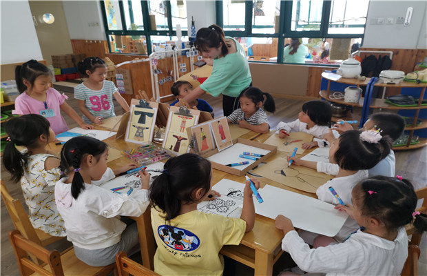祖国有许多有名的人文景观和名胜古迹,更有着悠久的历史文化。从富有中国传统元素的京剧脸谱、中国特色的古建筑、国宝熊猫到中国现代飞速发展的军事设备、航天飞船,都成为了孩子们感兴趣的话题。由此,各班老师们结合孩子们的需要,让孩子们在玩美时光能尽情发挥。当活动宣布开始,只见藻幼娃们三两结伴来到预先想好的班级,开始自己的大胆创作。