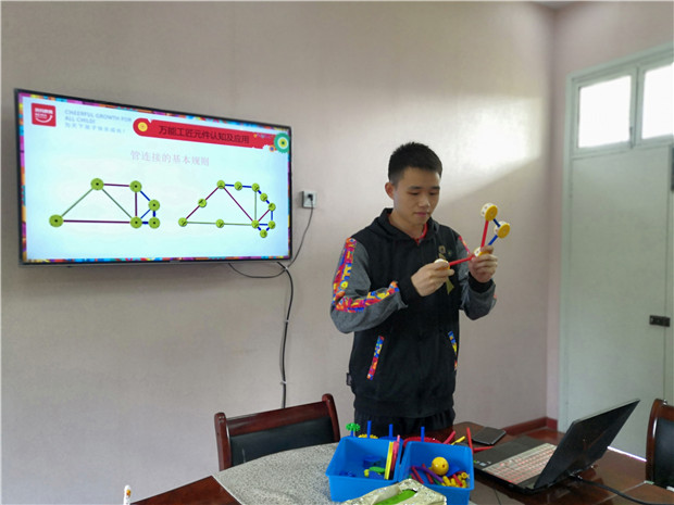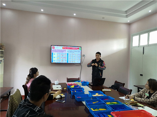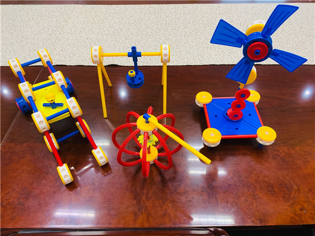活动中,连老师分别从万能工匠的理论概述、万能工匠的认知与应用、万能工匠的应用案例、万能工匠收纳标准四大方面进行培训讲解。连老师向我们介绍了万能工匠游戏材料的特性:它是由点、线、面、轴、齿五种材料构成,并简单展示了万能工匠的零件和拼搭,让教师了解了其特点和功能,并通过图片展示搭建后的成品,让大家眼前一亮。培训中,连老师通过游戏体验的形式,让教师参与其中合作建构,从而感受万能工匠“一物多用”和“一物多练”的乐趣。