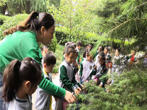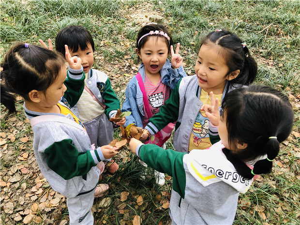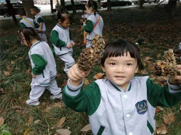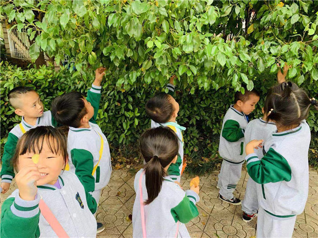 走在林间的小路上,孩子的小脚踏在落叶上发出沙沙的响声,一会儿轻轻踩,一会儿重重踏,沙沙沙、踏踏踏……这样的情境带给孩子无限的乐趣。他们边走边看,不时蹲下来找一找、闻一闻,不时传来孩子们的低语声……“老师,草都变黄了啊!” “老师,我帮这片树叶宝宝找到妈妈了,你看,是不是?”“老师老师,我找到秋天了,你看树上的那片叶子,是红色的。”沐浴着早秋的阳光,孩子们收集每一片飘落的树叶,惊奇于藏匿在草丛里的秋虫,开心着自己的小小的发现……他们以自己的视角寻找不一样的秋天。