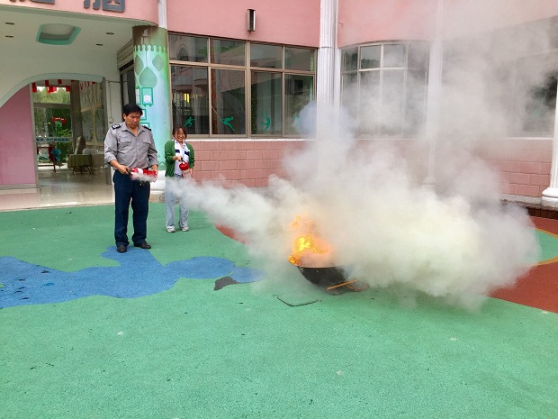 “呜……”警报拉响了,在全园师生完全没有准备的情况下,随着急促的警报声响起,孩子们捂住口鼻,弯腰低姿势地行进,迅速、有序地撤离到操场,教师及时清点人数,活动现场紧张有序。紧接着,请老师、保育员和保安当场练习使用灭火器的方法。演练结束后,朱华娟副园长为小朋友们细心讲解了消防器材的识别、发生火灾后的一些自救方法、逃生方法及注意事项等相关消防安全知识。