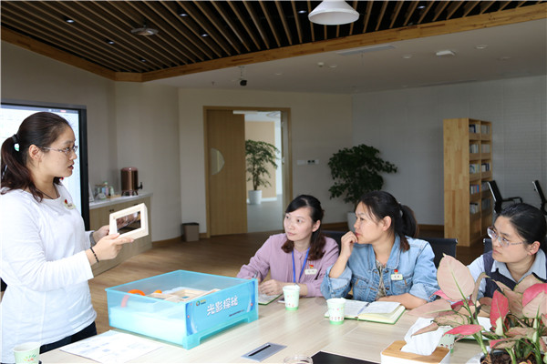 随着新园区的投入使用,如何让美术室、建构室、宝贝厨房、木匠工坊等专用活动室发挥最大效益,一直是大家关注研究的重点。在这次的党支部会议中,宋一叶主任组织大家围绕新园区专用活动室的资源开发与利用开展了讨论。经过事先准备,各位党员同志根据自己的能力和专长对园区投入的幼儿游戏材料进行了玩法探究,并在本次会议中结合ppt和实物展示向大家生动地进行了解说,更通过结对的形式,保证后续实践工作的问题解决。