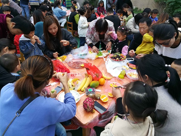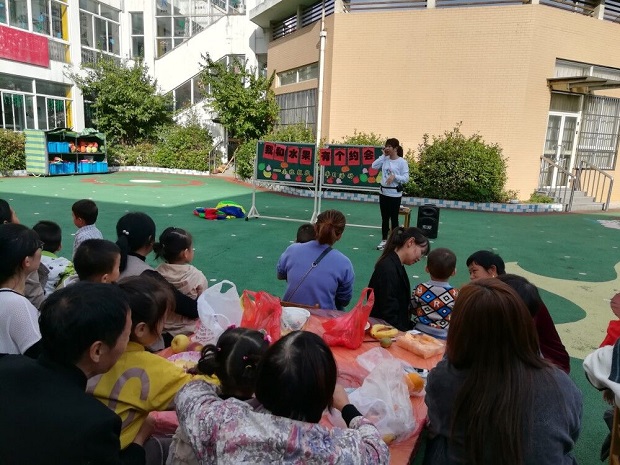 秋天是水果丰收的季节,孟河实验幼儿园富民园区小班年级组开展了我和水果有个“约会”的家长半日开放活动,邀请了每位家长制作水果拼盘。首先甜甜老师以一首动感十足的《小苹果》开场,让所有的家长朋友们和孩子一起来个亲密接触。接着以每个班为单位来个游戏《水果蹲》,孩子们们和爸爸妈妈玩的不亦乐乎。最后爸爸妈妈和孩子们一起动手,默契配合,不一会儿,一盘盘造型新颖、色彩斑斓、果香四溢的水果拼盘呈现在大家面前,个个脸上都笑开了花。
