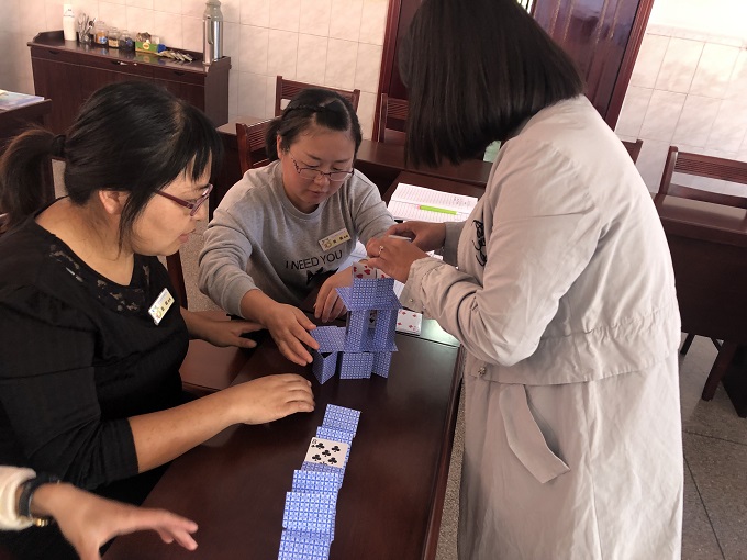 活动一开始,主持人孟老师以游戏垒扑克牌开场。三个级组大显身手,通过折、叠、垒建构出了一座座大楼。通过游戏我们也可以发现只要团结动脑,一切困难迎刃而解。主持人孟老师先对第一、二章节内容结合自己的思考做了简单的梳理。接着进入活动高潮部分,大家围绕所推荐的书目的精彩内容,结合自身工作实际和生活体验,从各个角度畅谈自己读书的所思所想、所感所悟,或阐述观点,或畅谈体会,尽情分享着读书的收获与快乐。分享交流过后,主持人组织级组教师围绕第一、二章节内容针对以后的数学活动或区域活动中需要注意或整改的方面进行研讨与交流。我们发现,平日里在各班组织数学活动、益智区游戏创设中的遇到困惑与思考都能从书籍中找到答案,为以后的活动打开了教师的思绪。