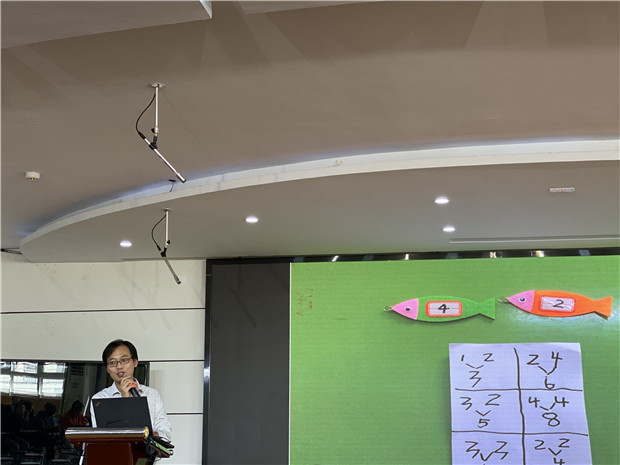 王老师根据幼儿的学习特点,以大班组数学研究为例,从数学区域创设的价值,数学区域活动的设置,数学区域活动的指导三个方面,详细解读了如何开展幼儿园数学区域活动。王老师结合大班组李云艳老师班的《数小棍》游戏、《钓鱼》游戏、石贝老师班的《穿手链》游戏、奚梦洁老师班的《扑克牌》游戏,运用生动鲜活的例子,重点阐述了数学区的材料投放要遵从目的性、层次性、多样性、可检性、开放性原则。针对不同年龄段的幼儿,王老师讲述了数学区域活动的不同形式,适宜的游戏策略,多元的评价艺术。