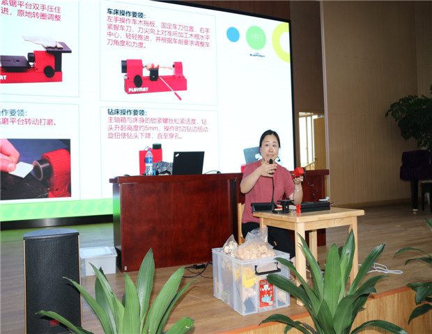 培训分为理论和现场演示两部分。优优老师从创造、思维、探索、沟通四个方面阐述了木工文化以及木工坊对于孩子发展的价值和意义。接着她针对木工坊的设备组成、工作流程、区域规则等逐一讲解了刨刀、U型锯、锯床、磨床等工具的安装和使用方法。在随后的现场演示环节中,优优老师通过安装各种机床以及使用锯床、磨床、钻床等一系列工序的过程,制作了有趣的木制品,如:相框、挂饰等。老师们真正感受到了木工坊带来的乐趣和木工工具带来的便捷。