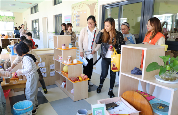 小班孩子在老师的带领下开展小班混班游戏,中大班则是开展了混龄游戏。老师们在观摩游戏活动的同时也参观了幼儿园室内的环境。纷纷表示空间布局合理,能多角度利用空间为幼儿游戏提供支持。