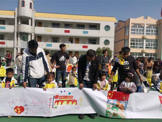 在中心幼儿园的大操场上,孩子们与家长手牵手,伴随着音乐《我和我的祖国》走进操场,以班级为单位排好队,观看了升旗仪式。陈丽丽副园长为此次活动致开幕词,并宣布活动开始。孩子们、家长们纷纷拿出早已准备好的各式绘画工具开始了即兴创作,在绘画纸上,孩子们与家长们密切配合,精心构思,用形式多样的绘画材料,描绘了一幅幅个性鲜明的精美图画。鲜艳的五星红旗、雄伟壮丽的天安门、色彩缤纷的气球、红红的灯笼、生日蛋糕……在温馨和谐的的亲子合作氛围中,一幅幅栩栩如生的画面逐一呈现。最后,家长与小朋友和他们自己倾情创作的作品合影留念。最后,我园以画展的形式,将幼儿与家长的作品一一展示在幼儿园门口。