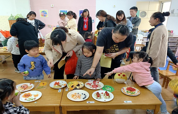 小班组亲子创意水果拼盘:家长与孩子忙的不亦乐乎,尽情发挥的创意,运用灵巧的双手,分工合作,共同完成属于自己的水果拼盘。一件件充满童趣的作品让人目不暇接、眼花缭乱。