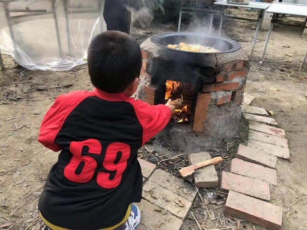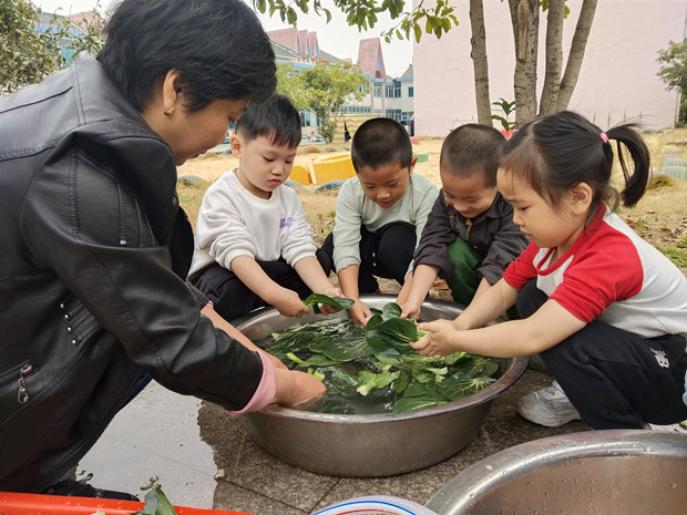 买完菜回来后,小朋友撸起袖管跟着奶奶学习洗菜,摘菜,学得有模有样呢。在煮菜环节,小朋友们各司其职,有的烧火、有的拌料、有的学着包饺子……叮,点心时间到!中一班小朋友吃的是“海底捞火锅”,中二班吃的是大杂烩,中三班小朋友吃的是露天大排档,中四班小朋友吃的是自己动手包的香喷喷的饺子。孩子们参与了制作的过程,每一位小朋友都乐在其中。