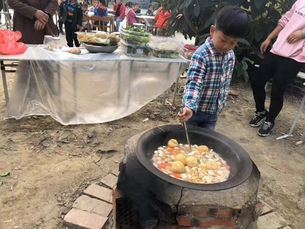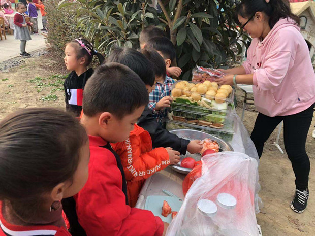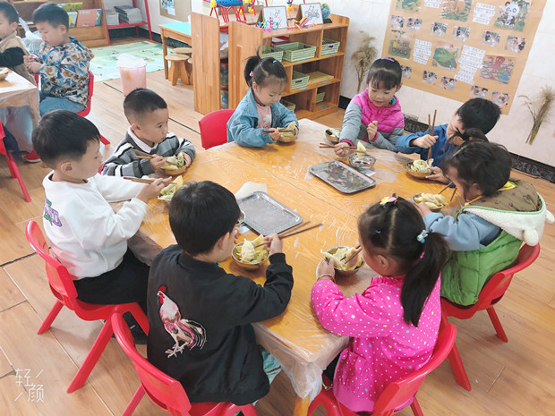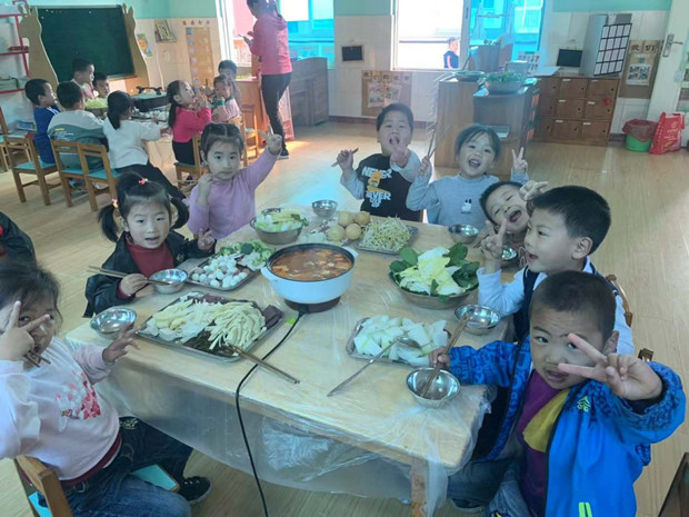 买完菜回来后,小朋友撸起袖管跟着奶奶学习洗菜,摘菜,学得有模有样呢。在煮菜环节,小朋友们各司其职,有的烧火、有的拌料、有的学着包饺子……叮,点心时间到!中一班小朋友吃的是“海底捞火锅”,中二班吃的是大杂烩,中三班小朋友吃的是露天大排档,中四班小朋友吃的是自己动手包的香喷喷的饺子。孩子们参与了制作的过程,每一位小朋友都乐在其中。