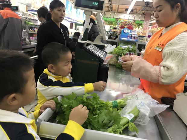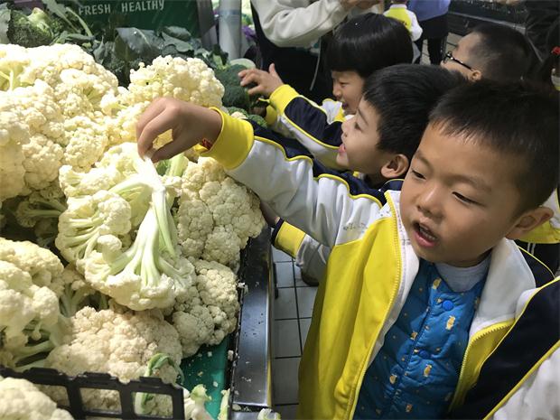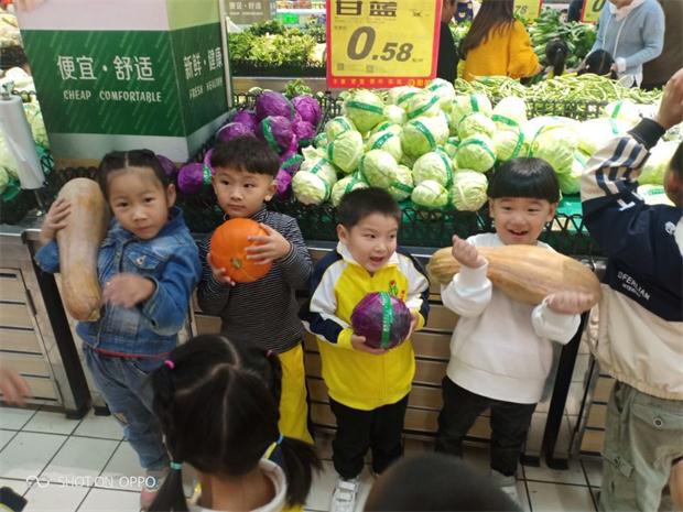 到达超市后,在老师和爱心家长的帮助下,孩子们分别开始买菜,他们摸一摸蔬菜的形状、说一说蔬菜的颜色,闻一闻蔬菜的气味,猜一猜食用的部位和生长环境……孩子们穿梭在一排排摊位前,时而细心挑菜,时而大胆地与摊主问价,并不时交头接耳、窃窃私语,快乐地和小伙伴们分享着自己的发现。不一会儿,孩子们就收获颇丰,他们高举自己的“战利品”,喜悦之情溢于言表。