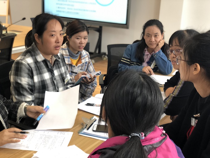 主持人徐老师为我们设计了“正话反说”的游戏,每位老师需将主持人所念词句依照顺序反向大声念出。一个个幽默、风趣的小短句在我们老师大脑的快速反应下脱口而出,瞬间赶走了中午的淡淡困意。接着便是研讨篇,先是由果果(3)班的老师就益智区的材料投放时间与幼儿前期游戏经验进行简要的阐述。再分组围绕结合主题背景下的区域游戏材料投放与幼儿游戏状态,剖析益智区材料是否适宜及集体活动中,结合幼儿活动现场发现教师的支持策略,如果是你有什么更好的支持策略进行研讨交流。在反思交流环节,我们果果三班的潘老师也发现大班益智区游戏材料的选择与投放时,应基于大班幼儿的认知基础、身心发展和最近发展区,统筹考虑益智区游戏材料对大班幼儿协调发展的适宜性,力求让适宜性的游戏材料“最大化“地促进大班幼儿智力的发展,能力的提升。最后两个小组研讨的代表教师也针对以上两个问题作出了交流与分享。最后,蒋老师也对本次教研进行了总结性的评价与提升,作为幼儿园教师应努力探索大班益智区游戏材料投放的方式、方法、策略,掌握大班益智区游戏材料投放应遵循的基本原则,注重材料投放的目的性、适宜性、层次性、丰富性、结构性,重视及时更新、更换更有利于让大班幼儿智慧得以启迪,思维得以提升的游戏材料,以促进大班幼儿的良性发展。