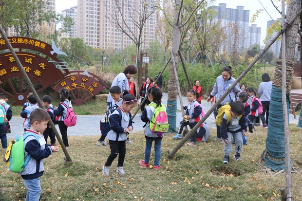 踏进公园的大门,满树的黄叶、宽阔的草坪映入眼帘。孩子们用亮亮的眼睛寻找秋天的气息,观赏植物的变化。随风而舞的芦苇、金黄满地的秋叶、毛茸茸的狗尾草,孩子们通过看、摸、闻感受大自然的魅力。而公园中以农耕文化为主题的铜像更是一大特色,孩子们通过栩栩如生的铜像了解了江南农耕文化与秋收习俗。欣赏美景后孩子们纷纷从背包中拿出食物围坐在一起与同伴分享美食以及一路的所见所闻。