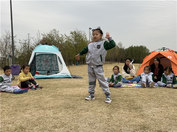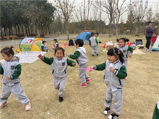 活动当天,早上9点,孩子们到达阳光草坪后,在热心家长的帮助下搭建一个一个的帐篷,并为自己的“家”贴了一个美美的名字,有“彩虹小镇”、“蝴蝶空间”、“小兔之屋”、“小花村庄”……帐篷搭建完成后,孩子们分组开心地游戏,有的踢足球,有的放风筝,还有的用放大镜观察小树的变化。终于到了美食分享的时刻了,孩子们分享着自己带来的爱心餐,有寿司、三明治、馄饨,还有各种营养丰富的水果点心,体验和同伴在一起的快乐。下午孩子们自我展示节日,有唱歌、跳舞、念儿歌等等,欢声笑语充满了整个草坪。