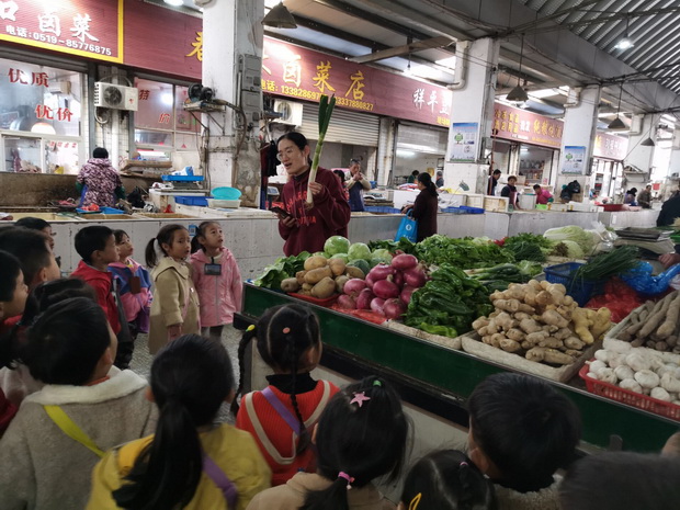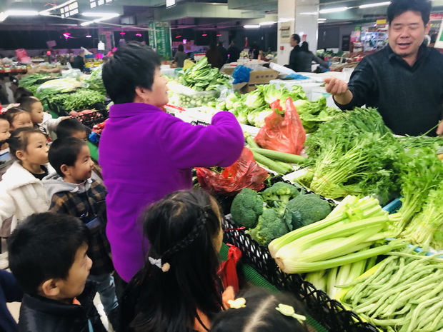 孩子们排着整齐的队伍,在老师的带领下来到菜场参观。进入菜场,菜场里人来人往、十分热闹,孩子们穿梭在一排排摊位前,兴奋地讨论着。走到蔬菜摊位前,孩子们的目光立刻被色彩斑斓的蔬菜吸引了,他们兴奋地向身边的小伙伴介绍自己所知道的蔬菜。在老师的鼓励下,孩子们询问了卖菜的爷爷奶奶一些自己所不知道的蔬菜的名称及营养价值,爷爷奶奶们也很热情地向小朋友们一一做了介绍。回到学校之后,各班组织了相关的谈话,让孩子们讲一讲菜场里有哪些菜,爷爷奶奶是怎样买菜的。孩子们在丰富生活经验的同时,还可以将今天学到的经验迁移到角色游戏中。