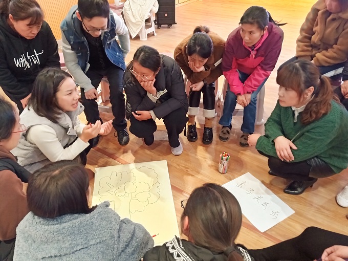 本次活动以游戏体验为主。活动伊始,吴老师带领着老师们进行了暖身活动——泡泡糖的游戏。主持人喊“泡泡糖”大家要回应“粘什么”,主持人随机想到身体的某个部位,台上的人就要两人一组互相接触主持人说的部位。看,老师们,玩得多开心呀!接着进入第二环节技术体验:心有千千结。这个环节需要全员做到:遵守契约、有始有终;全情投入、积极参与;用心感受、真诚表达。心理沙龙活动,内容丰富,形式多样。通过不断的调换位置,让教师说出自己心中最真实的想法更是将整场活动推向高潮。每位教师根据主持人所提供的的问题,围坐在一起分享自己的心灵感悟。最后,技术体验:积极关系策略树。根据研修要求,通过讨论,创作一幅“积极关系策略树”,树根是发生事件,树干是“核心策略”, 树枝和树叶是主要策略,果实的效果和成果。一切准备就绪,正式的团队挑战开始了。我园分为两组“师幼关系”和“亲子关系”进行。只见现场大家相互鼓励,积极配合,热烈讨论,不断实践,最终一起以优异的成绩成功完成挑战。