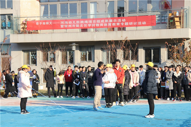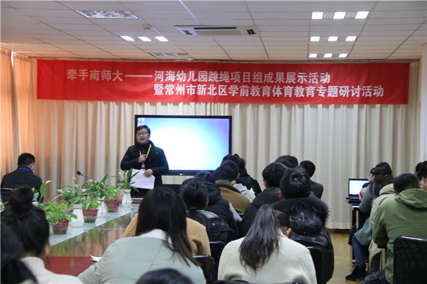 12月4日,河海幼儿园举办了跳绳项目成果展示暨新北区学前体育教育专题研讨活动。南京师范大学陈培友教授、刘同记副教授,新北区教师发展中心徐志国老师以及所有男老师,及周边幼儿园120多人参加了此次活动,分为四个部分。