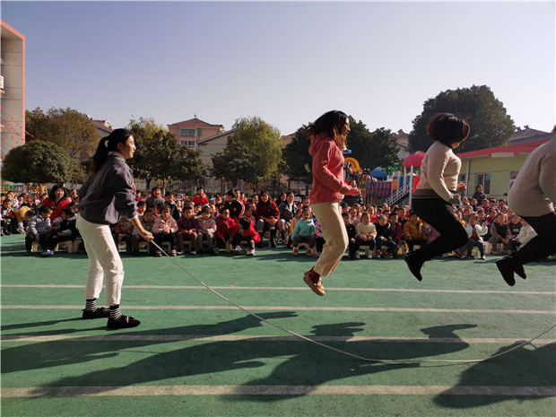 跳大绳是一个集体的游戏,不但锻炼体力,而且特别有助于提高灵活性、协调性。当老师们一个接一个地跃入大绳,跳起整齐划一的步伐,台下的孩子们激动地忍不住喊起来到1、2、3、4……20,在孩子们响亮的加油声中,老师们的记忆也瞬间被拉回了童年。