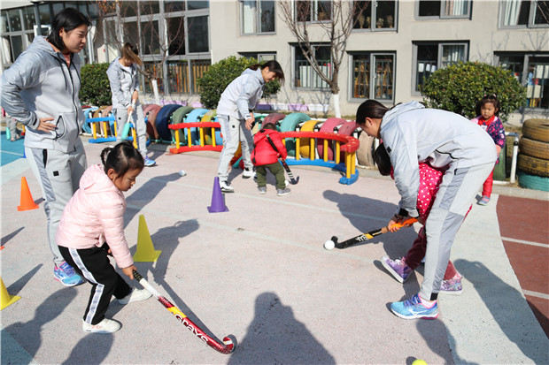郝卫锋老师作为幼儿软式曲棍球领衔人,带大家到户外运动场地观看曲棍球游戏现场。女曲队员与孩子们进行互动,并指导他们如何正确握棍,如何击中目标等。女曲队员还与孩子来了一场6VS6,2比2平局的友谊赛。