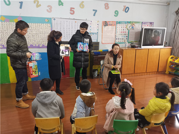 2019年12月25日上午,河海幼儿园的老师们来到富都社区开展义务送教活动。老师们给孩子们送去了50本书籍和玩具,戴老师给孩子们带去了好听的故事《贪吃的小蛇》,薛文杰老师组织幼儿玩了有趣的音乐游戏《乒乒乓》。他结合幼儿年龄特点,在科学地引导幼儿,配合生动的音乐,充分调动幼儿参与音乐游戏的主动性与积极性并进行快乐游戏,体现了寓教于乐的教育理念。