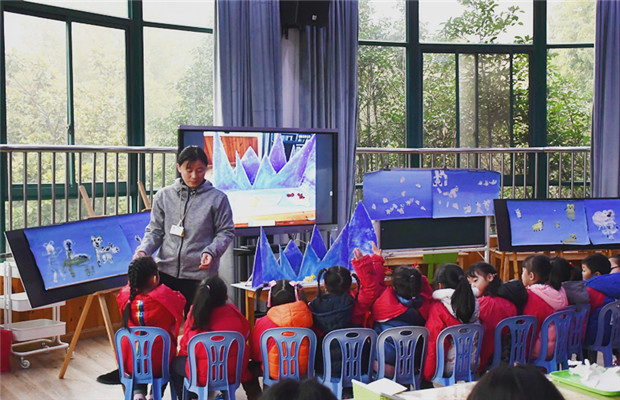 契合当下季节特质,大班的李兰老师展示了美术活动《北极熊乐园》,引导幼儿在北极冰川的情境中,通过欣赏、观察北极熊的形态特征,自主选择喜爱的表现方式表现憨态可掬的北极熊。活动中有的孩子大胆地用水粉颜料勾画,有的用撕纸的方式表现,还有的用超轻黏土捏出可爱的北极熊,呈现多样的表达方式。