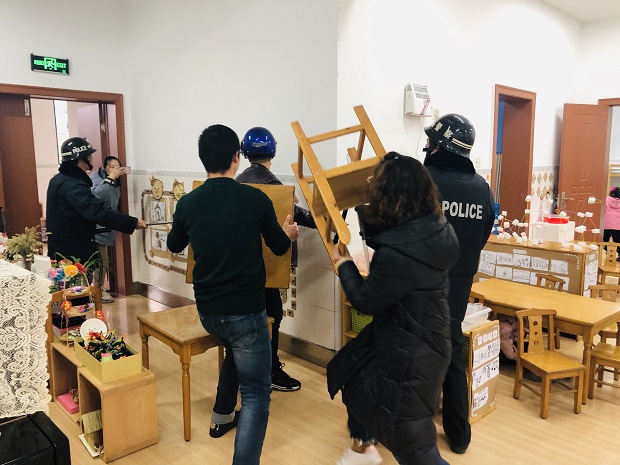 紧接着,班级演练活动开始。下午3:50分,由一名男教职工扮演的“歹徒”尾随一名教师进入校园,幼儿园老师与保安迅速手拿椅子、盾牌、扫帚等形成一道防护墙,阻止“歹徒”向班级内部突进。保安、教师与“歹徒”在对峙过程,逐步缩小包围圈,将“歹徒”逼至角落,将歹徒制服。