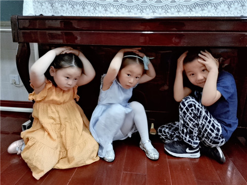 演练中,随着“地震警报”发出后,幼儿纷纷抱头并在室内避震,室内的桌椅、坚固的钢琴、墙角的三角地带等处都是幼儿的身影。教师悉心检查并纠正幼儿不正确的姿势,以确保每位幼儿都习得正确的避震技巧。在“地震警报”解除后,教师带领幼儿迅速疏散到指定的安全地带,整个活动秩序井然,有条不紊地展开。最后,各园区活动负责人对各班用时进行统计并现场总结,也为下一次活动开展提供参考。