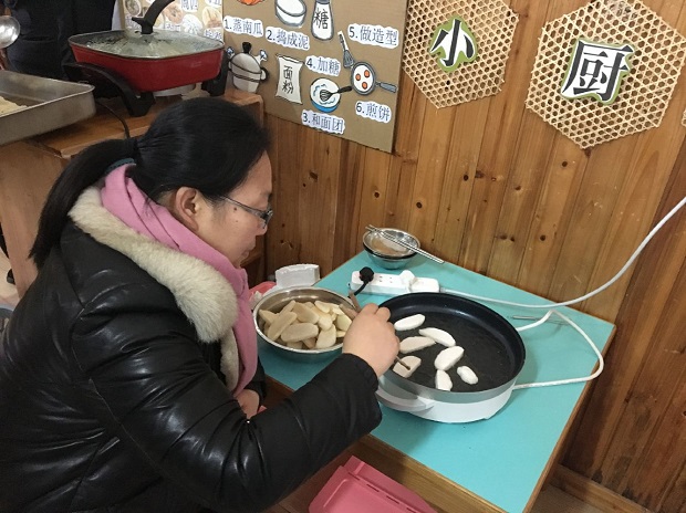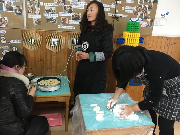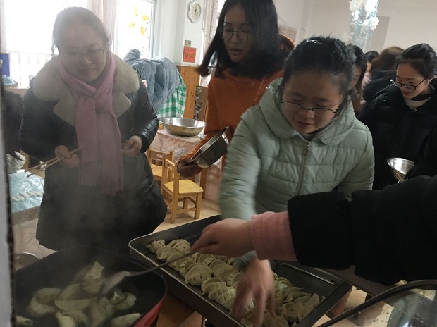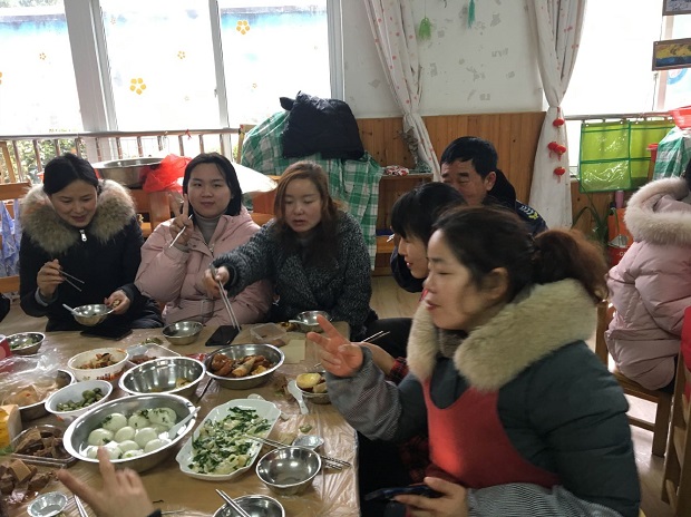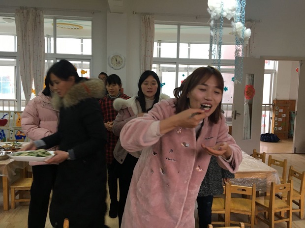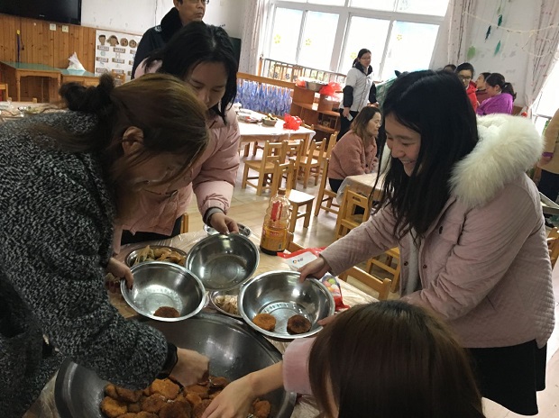在研讨过程中,虽然想法各异,意见不一致,但有老师提出来,农村幼儿园,就要开展有农村特色的团餐活动,那些上辈子遗传下来的手艺——手工制作的点心是时候展示一下了。最后得到了大家一致赞同。因此,每一位员工都跃跃欲试,要展示自己的身手。大家自报手工艺特长,南瓜饼、炒摊饼、春卷、饺子、糯米团子、蛋挞、胖团子、玉米烙……特殊的“菜单”在教职员工的报名中应运而生。为了能在这次活动中展露自己特殊的一面,很多教职工在家里进行了练手热身,反复尝试,或请教妈妈,或拜师婆婆,力求让自己的制作能得到大家的认可。13号一大早,大家分工合作忙开了:择菜、洗菜、切菜、焯菜、拌馅料,揉的揉、包的包、煎的煎、炒的炒、炸的炸……阴雨霏霏的天气,安幼到处都是火热一片。上至园长,下至厨房,都在为这次团餐活动忙活着。中午时分,别样的餐点新鲜出炉啦:大班组搬出了韭菜摊饼、南瓜饼;中班组拿来了蛋挞、春卷;小班组则将水饺和糯米菜团子搬上了餐桌,行政组的“胖团子”也闪亮登场,后勤组的玉米烙……色香味俱全,让人看了垂涎欲滴。顷刻间,嬉笑声、祝福声汇聚成了一片欢乐的海洋。别样的午餐别样的情,大家品尝着独特的“美食”,分享着内心的欢乐,处处都是“幸福大家庭”的开心氛围!