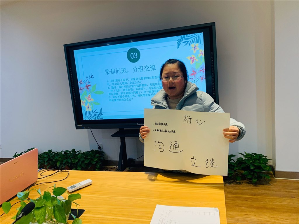 第三个环节的聚焦问题,分组交流,教师们分为小、中、大三个年级组分别针对问题一:“你们班有个孩子,如果自己想要的东西没有得到,就大发脾气。作为幼儿教师,你怎么办?”问题二:“通过一段时间的日生活的观察,发现幼儿跟其他的幼儿不一样(比如:自言自语,多动等),与家长沟通了并建议去医院进行检查,家长表面上同意了,但一直没有行动,你该怎么办?”问题三:“家长不配合班级工作,每次都说我不会,我没时间。针对这样的情况你该怎么办?”进行交流,积极发表自己的想法,梳理出解决以上三个话题的解决策略。