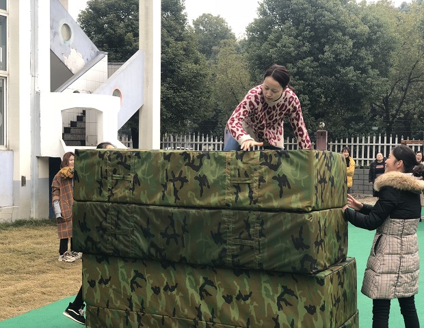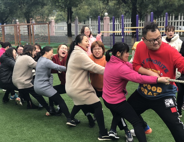 在赛前我们以抽签的方式进行分组,并为自己的战队选取了队长和队名。运动会分为“集体跳长绳”、“跳短绳”、“勇攀高峰”、“集体拔河”4个项目。首先是“集体跳长绳”项目。瞧!教工们一个接着一个绕8跳绳,有的或身轻如燕,有的或动作笨拙,但大家都斗志昂扬、全神贯注地投身到比赛中。操场上,“绳”彩飞扬,加油声、欢呼声此起彼伏。教工们团结一致、互助打气,积极参与。现场一片欢声笑语、其乐融融。“勇攀高峰”项目每组选派8人从起点出发,助跑翻过高垫子,走过平衡木,跳到矮垫上,跑回起点与下一组员击掌接力,以完成速度的快慢确定输赢。垫子有4层高,一次翻不过高垫子,再来第二次、第三次,大家不放弃,奋力拼搏。拔河赛场上,在队友的加油呐喊声中,参赛队员个个精神抖擞,摩拳擦掌,涨红了脸,全力以赴,团结一致。教职工们在运动会上展示了自己另一面的风采,胜利时她们也会如孩子般在场上欢呼雀跃,失败时不气馁,在赛场上尽情挥洒着激情。活动中体现了教职工一家亲的团队精神,也进一步促进了教职工间的互动、沟通与交流。比赛结束后,王主任根据比赛成绩给大家颁发了奖品,拿到奖品的老师们露出了开心的笑容,满载而归。