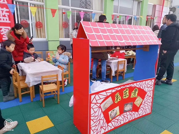 各位大小朋友,开始逛庙会啦!塑胶场地上,展示了12个摊位,有民俗游戏区域,有中华美食小铺以及传统手工制品区。家长和小朋友玩得开心不已!